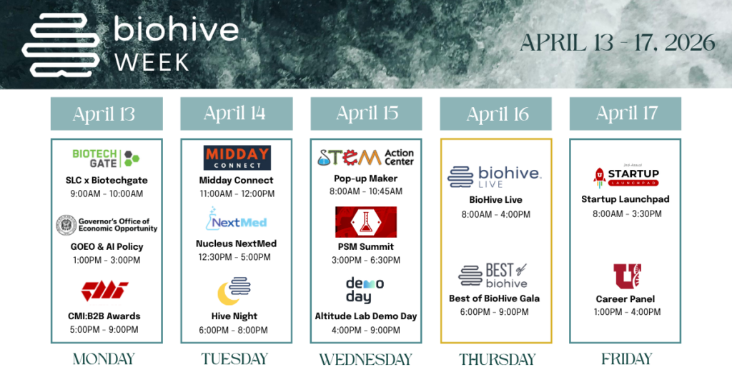 BioHive Week aims to inspire and motivate our ecosystem while showcasing Utah as the place where innovation occurs, companies scale, talent thrives, investors invest and patients benefit.